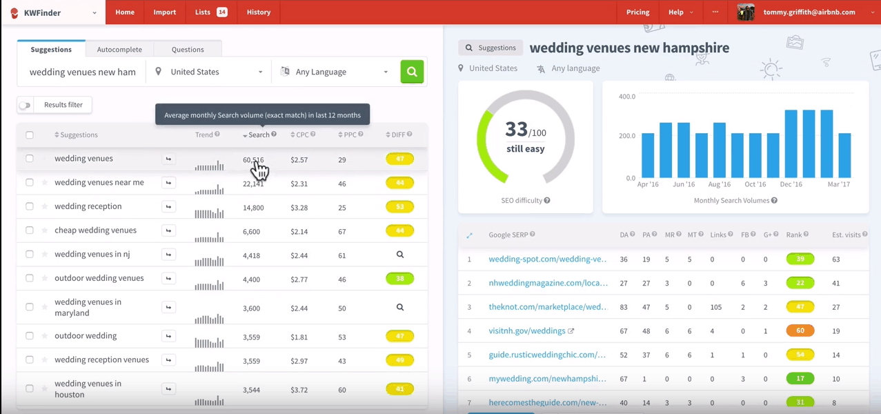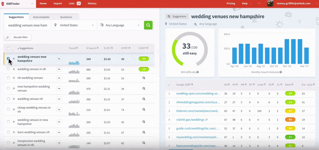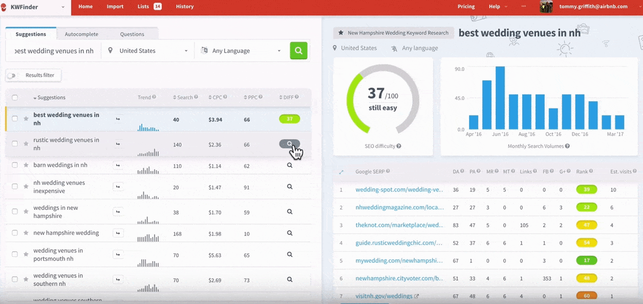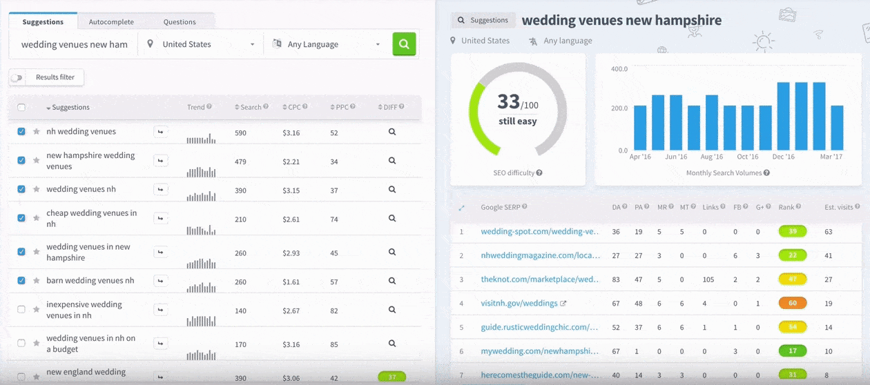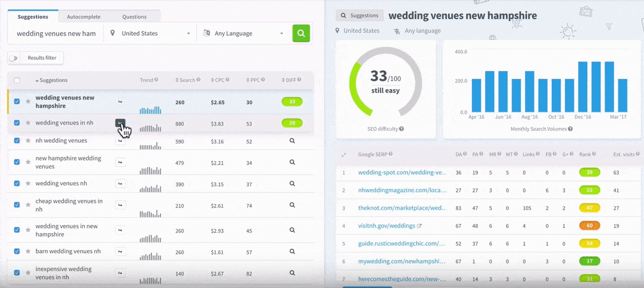 Gauge the term that you would search for when looking for a wedding -venue in New Hampshire. Once you have one – type that into the box that says ‘enter the keyword,’ and click ‘Find Keywords.’