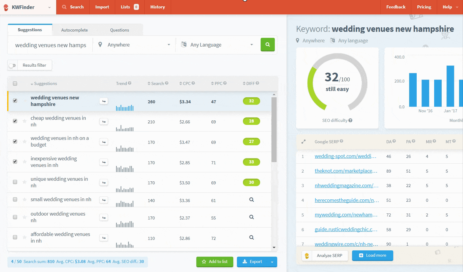 If the list is new, you’ll be prompted to give the list a name. For example, we would call it New Hampshire Wedding Keyword Research.