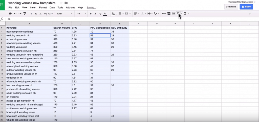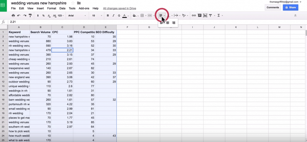 Now, we’ll want to make our keyword list a bit more presentable and workable. Center all the text in the spreadsheet, and make the cells bigger to see all the information clearly.