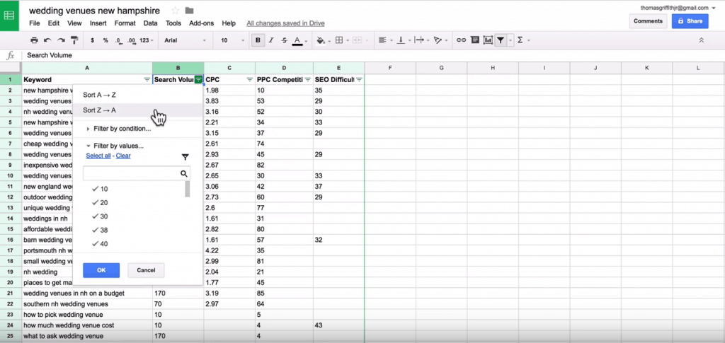 Add a filter to each column, and then sort the data by ‘search volume,’