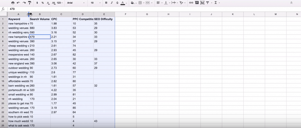 If there are any metrics that you are not using for your keywords, delete their columns. Most keyword maps don’t use the CPC or PPC columns and are often disposed of.