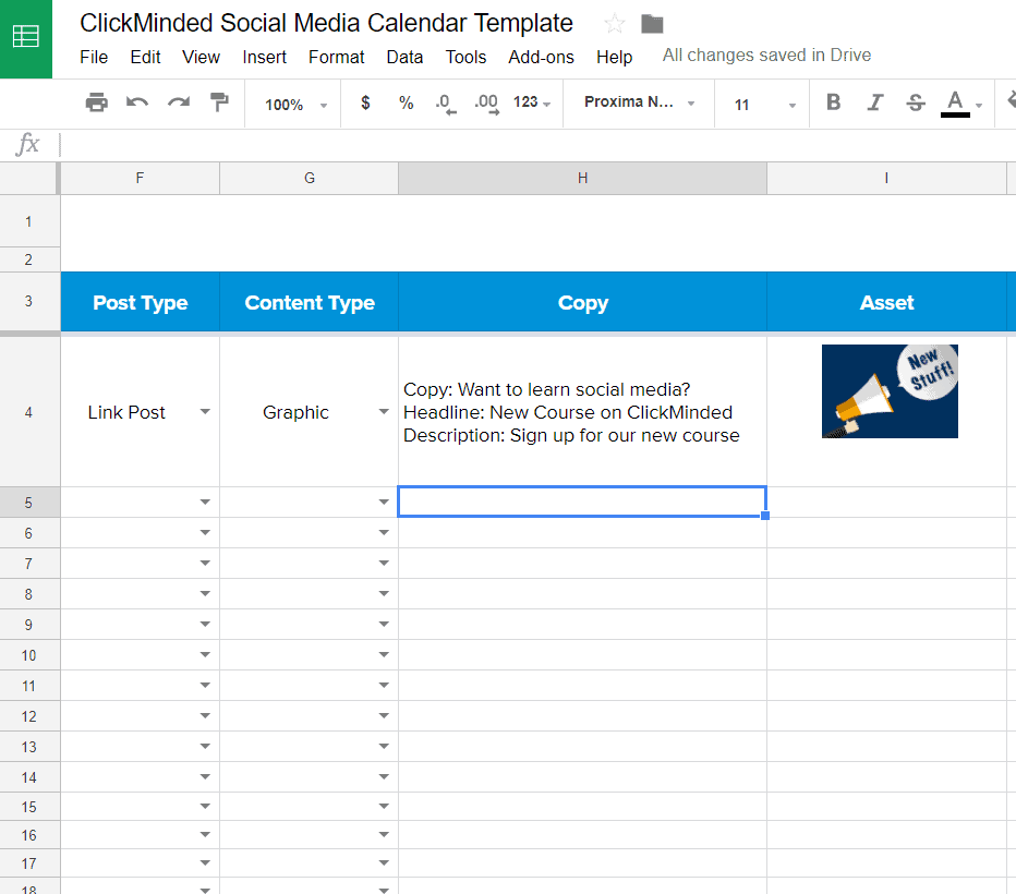 Here, you’ll adjust the cells on the spreadsheet to align better with your social media plan of action. They can be edited to be more in tune with how you operate on each channel.
