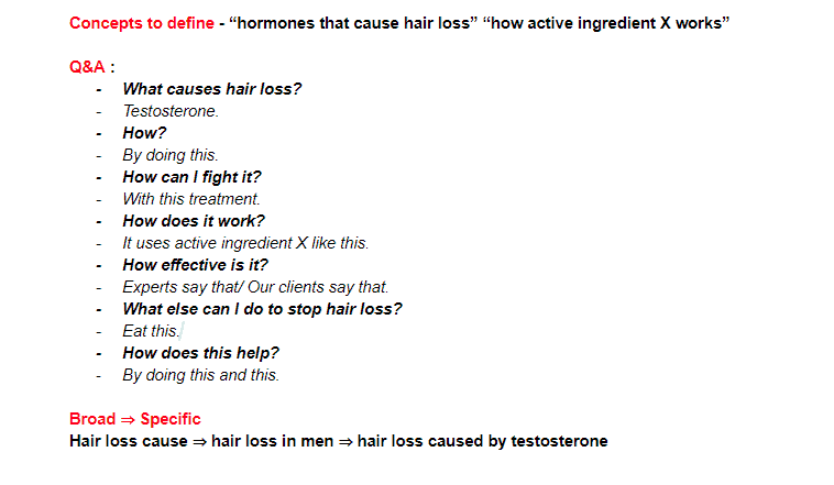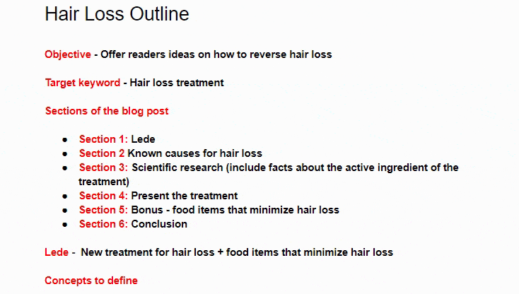 1. Return to the outline file and create sections for your blog post. Make sure each section highlights the information the user will want to read. In the example of the ‘Hair Loss Outline’, we can section it like this: