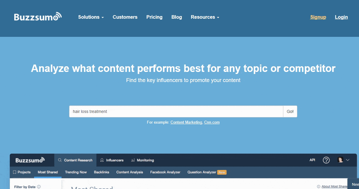 1. Log on to Buzzsumo and type in your keyword. In this case, it would be ‘hair loss treatment’, as seen in the picture below.