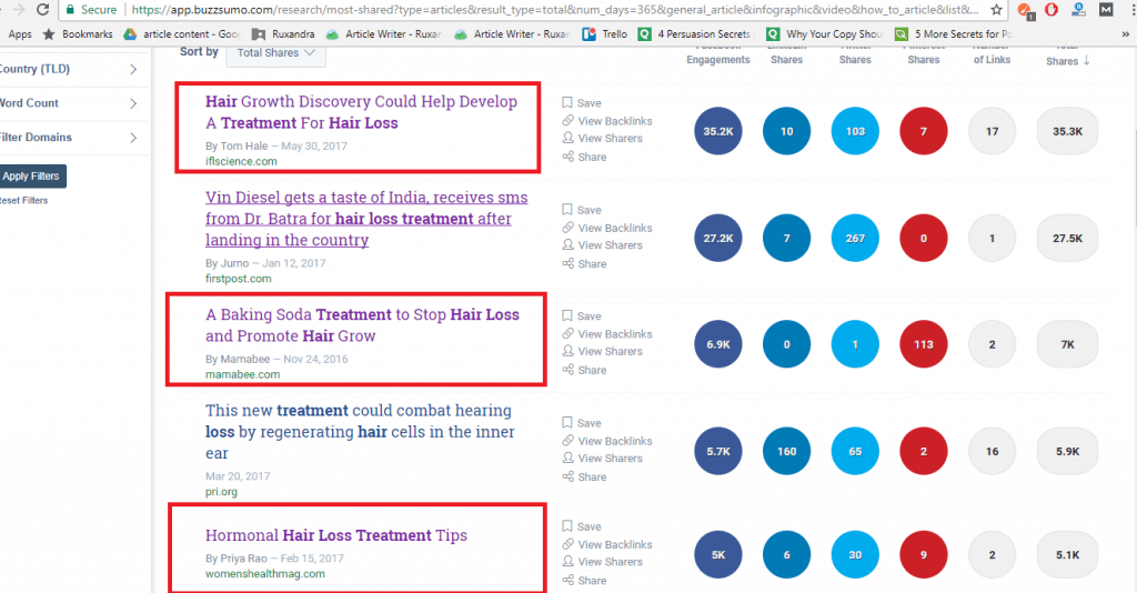 - When you get the results, make sure that they are filtered by ‘number of shares’. View the results and select the top 3 – but double check they are relevant to your target keyword.
