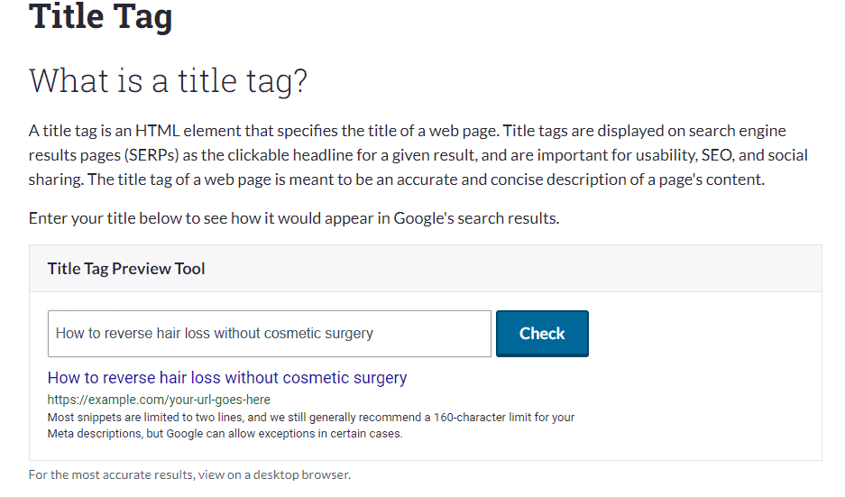 - First, use the tool to check the length of your title. It should be under 65 characters. Otherwise, it won’t be in full view of the search results.