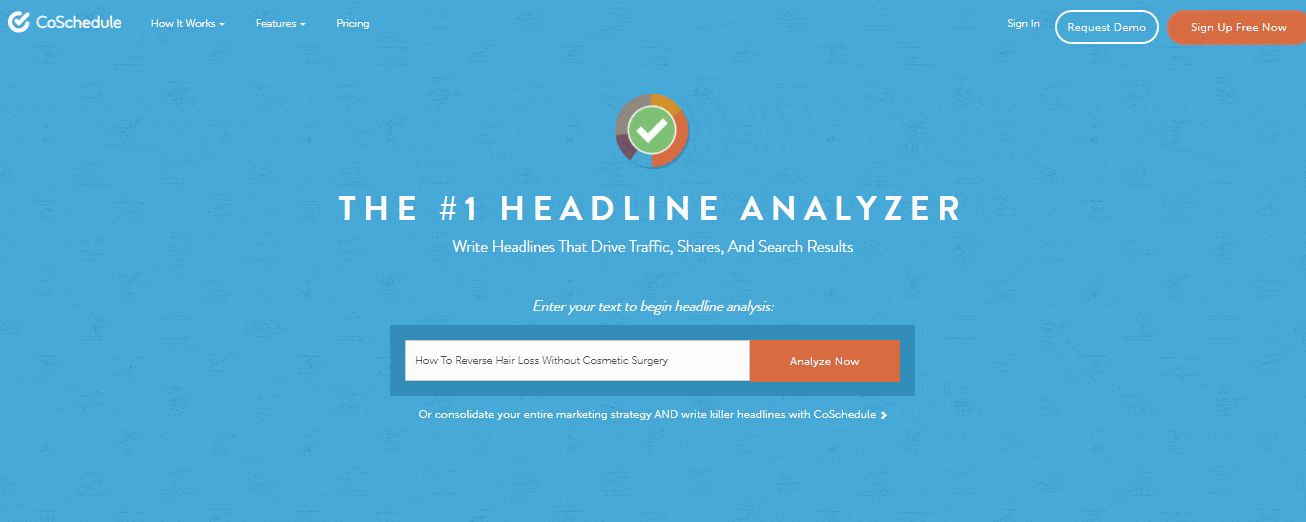 4. Open up the CoSchedule Headline Analyzer to put a score to the 10 selected headlines. You can see in the example below with the ‘How To Reverse Hair Loss Without Cosmetic Surgery’, it received a score of 68. That’s not bad, but it could definitely be better.