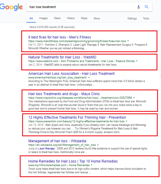 - See what top 5 results come up that most resemble a blog post. You’ll see that in the ‘hair loss treatment’ result – there is a Wikipedia article. That is more of an informational piece than a blog post, so you can leave that one out.