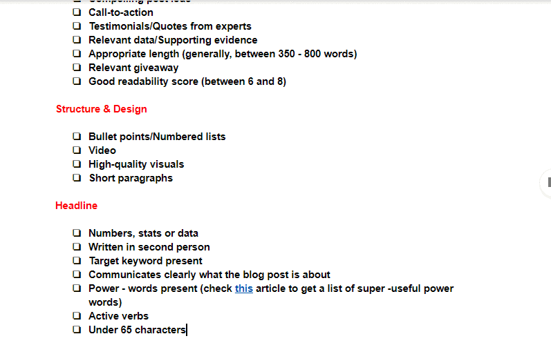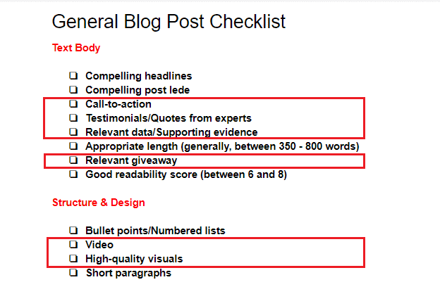 4. Bring up your General Blog Posts Checklist, and compare a couple of these articles to see how many boxes are ticked. If they aren’t addressing them all, that can help give your blog post a competitive advantage! See the picture below to get a reminder of what the checklist looks like.