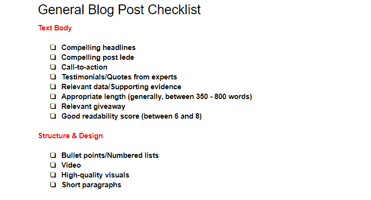 Congratulations, you now have a workable outline that helps deliver an exciting blog post for your readers. All that’s left to do is give it a review against the General Blog Post Checklist, ticking off the characteristics featured in the mix.